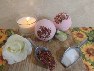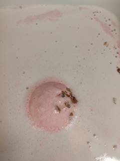 If you like the smell of fresh roses you will love this bath bomb. You will be able to smell the roses with hints of Jasmine, musk and sandalwood. It is topped with dried rose pedals.